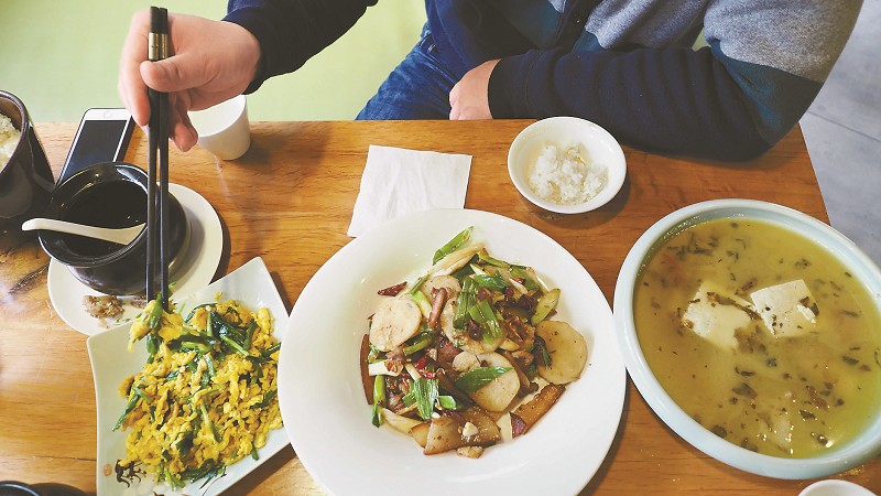 3月15日,在成都高新区的岫云村线下体验店,一位消费者品尝用山村出产的食材制作的酸水豆腐、韭菜炒鹅蛋、玉米馍、米豆腐炒腊肉等乡村美食,这一道道美味的乡村菜背后蕴藏了一个个感人的脱贫故事。