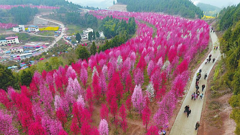 近年来, 紧邻成都的中江县太安镇着力打造服务“成都一小时经济圈”的休闲观光农业。当地引进投资开发山坡和荒地, 种植10多个品种约2000亩的观赏桃花,并硬化道路、修建停车场,对农房进行风貌改造,打造了一个风情独特的桃花谷。眼下,桃花盛开,吸引了各地的游人,进一步拓宽了山区农民的致富路。王平 摄