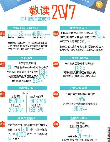 2016年四川法治蓝皮书则分析了四川抓领导干部这一“关键少数”推进法治的方法与成效。“这让‘关键少数’在践行并推进法治中头上有把‘剑’、心中有根‘弦’、脚下有条‘路’。”四川法治蓝皮书执行总编吕艳滨说。