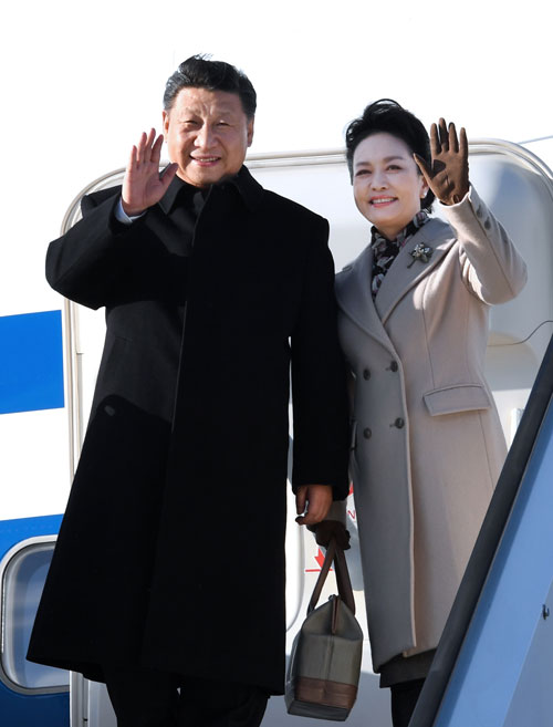 4月4日,国家主席习近平乘专机抵达赫尔辛基,开始对芬兰共和国进行国事访问。这是习近平和夫人彭丽媛步出舱门。 新华社记者 饶爱民 摄
