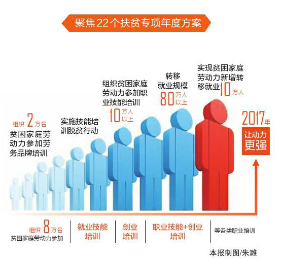 就业扶贫直接瞄准“穷根”,能收到“一人就业、全家脱贫”的效果。今年我省贫困家庭技能培训和就业促进扶贫专项方案提出:确保2017年实现贫困家庭劳动力新增转移就业10万人、组织贫困家庭劳动力参加职业技能培训10万人以上。省人社厅将如何实现目标?