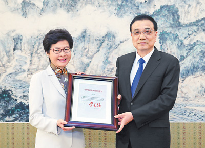 4月11日,国务院总理李克强在北京中南海紫光阁会见林郑月娥,颁发任命她为中华人民共和国香港特别行政区第五任行政长官的国务院第678号令。新华社记者 姚大伟摄