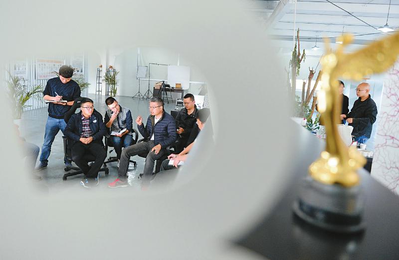 4月10日,在南充多维时空3D打印创业团队研发基地,两名创客在一款模具上粘贴定标点。 创业团队成员在一起规划未来。