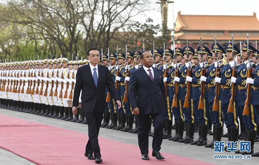 4月12日,国务院总理李克强在北京人民大会堂同来华进行正式访问的圣多美和普林西比总理特罗瓦达举行会谈。这是会谈前,李克强在人民大会堂东门外广场为特罗瓦达举行欢迎仪式。新华社记者李学仁摄