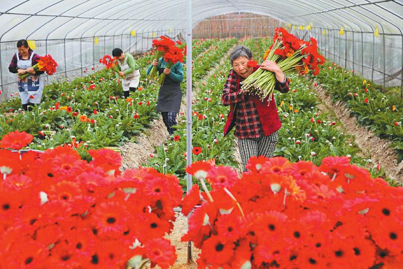 4月16日,眉山市彭山区凤鸣镇村民在明都花卉基地帮业主采摘非洲菊。彭山区在推进农业供给侧结构性改革中,成片流转土地发展有市场需求的花卉产业,仅在凤鸣镇的明都花卉基地就种植了上千亩非洲菊。 本报特约通讯员 姚永亮 摄