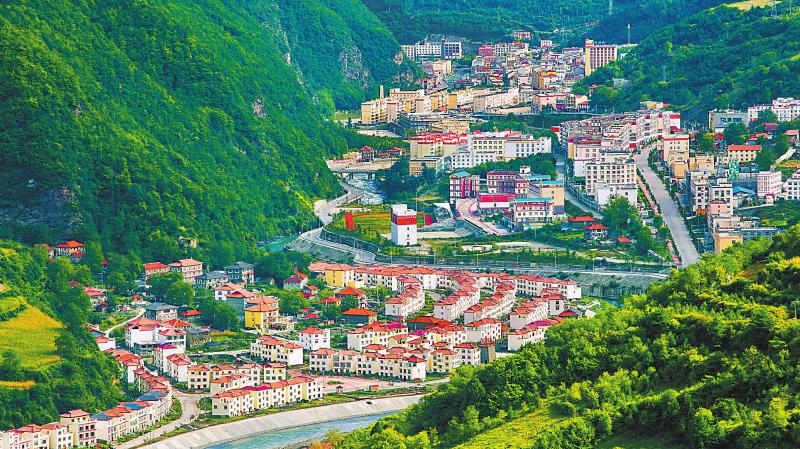 黑水县是国家级贫困县,全县把99条沟分成6大沟域,规划发展6大产业,带动群众脱贫增收。今年,全县28个村将完成脱贫摘帽任务。图为掩映在青山绿水间的黑水县城。 余阳 摄 (视觉四川)