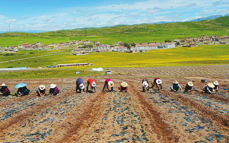 务工人员在栽种刚引进的玛卡苗。2015年阿坝州阿坝县沃朗村与邻近的洼尔玛乡铁穷村、安斗乡派克村建成了占地2000亩的“阿坝县高原生态农业示范园”,通过“集中成片、连带开发”和“以园区带动基地、以基地带动农户”的模式,辐射全县的蔬菜标准化生产,带动当地群众脱贫致富。 本报记者 何海洋 摄(资料图片)
