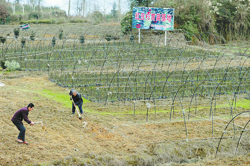 4月初,德应村红豆杉产业园内,村民在红豆杉育苗基地劳作。宜宾市兴文县麒麟苗族乡德应村受地理和交通等因素的制约,发展缓慢。近两年来,随着省市县加大对贫困村的产业扶持,德应村发生了巨大的变化。本报记者 何海洋 摄