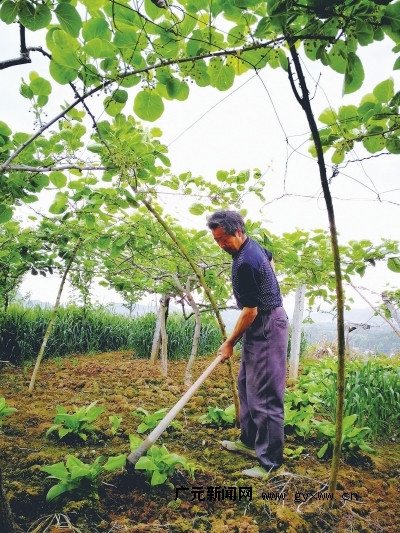 图为杜兆富正在猕猴桃树下劳作