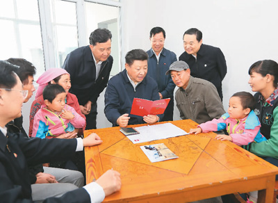 2016年8月23日上午,习近平在青海省海东市互助土族自治县五十镇班彦村村民吕有金家察看《扶贫手册》,了解扶贫措施落实情况。新华社记者 兰红光摄