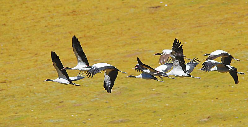 近年来,通过开展退牧还草还湿工程、爱鸟护鸟等活动,阿坝州逐渐成为黑颈鹤繁衍栖息的天堂,黑颈鹤是国家一级保护动物,是世界上唯一生长、繁殖在高原的鹤。每年3月至11月,成群的黑颈鹤都到此栖息,并且停留栖息时间逐年延长。图为4月22日,在阿坝县曼扎塘湿地,一群黑颈鹤在悠闲地飞翔、嬉戏。李刚 摄