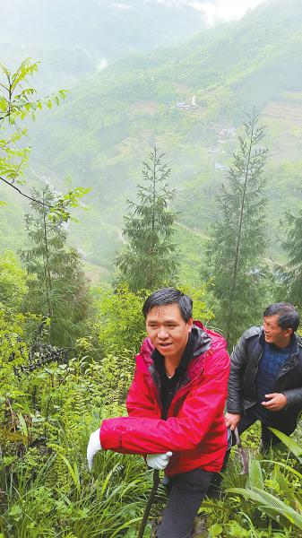 阿索拉毅(前)和村主任一起爬山回茶园村,查看柳杉林。 侯冲 摄