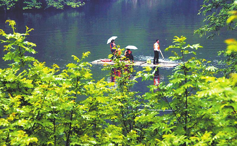 阆中市打造“半小时乡村旅游圈”,发展乡村旅游,在离阆中城区10公里的枣碧乡杨家河,投放一批从浙江采购的竹排,推出竹排旅游产品。同时,与之相配套的农家乐也正式接待游人。该旅游项目向游人推出以来,景区游人络绎不绝,也带动了当地农民脱贫增收。图为5月2日游客在杨家河划竹排游山水。 本报记者 李向雨 摄