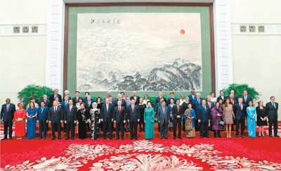 习近平和夫人彭丽媛在大会堂二层迎宾厅迎候,同贵宾们一一握手,互致问候。在大型壁画《江山如此多娇》前,习近平和彭丽媛同外方代表团团长及配偶集体合影留念。