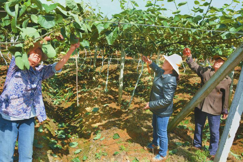 近年来,绵阳市安州区充分整合涉农项目、资金,在乐兴镇及周边打造了一个万亩猕猴桃走廊,依托该走廊,推动农旅融合发展。图为5月11日,乐兴镇新光村村民,正给猕猴桃修枝疏果。本报记者邹俊川 摄