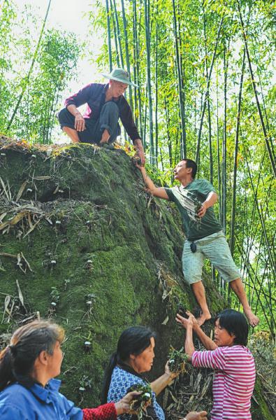 ②贫困户邓贵先(图上)在石头上栽种铁皮石斛。