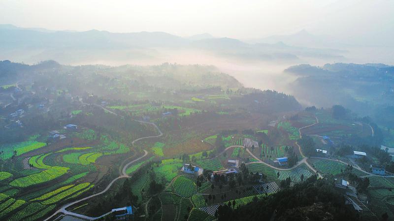 阳春三月的广元市苍溪县白驿镇岫云村,清晨薄雾中青山环绕,弯曲的村道和漂亮的民居。 本报记者 尹钢 摄(资料图片)