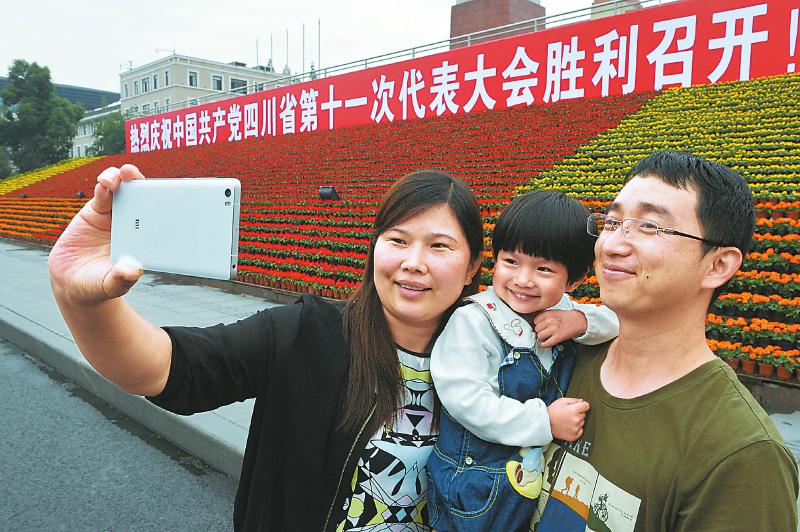 5月26日,市民在成都天府广场挂有热烈庆祝省第十一次党代会胜利召开的标语前留影。 本报记者 郝飞 摄