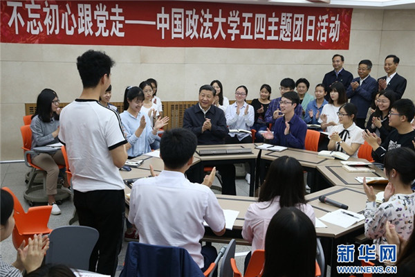 5月3日,中共中央总书记、国家主席、中央军委主席习近平来到中国政法大学考察。这是习近平在学生活动中心参加民商经济法学院本科二年级2班团支部开展的“不忘初心跟党走”主题团日活动。新华社记者 姚大伟 摄