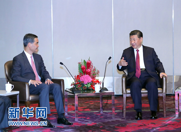 6月29日中午,国家主席习近平在香港会见香港特别行政区行政长官梁振英。新华社记者 鞠鹏 摄