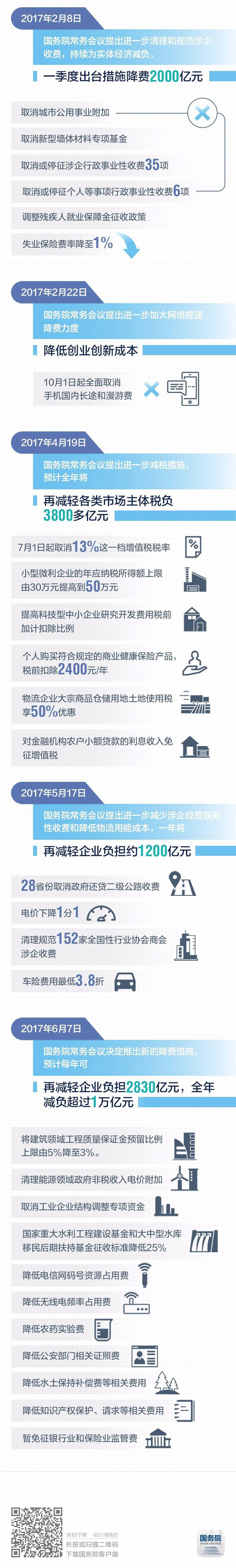 “全年为企业减税降费力争达到1万亿元。”今年3月份的两会记者会上,李克强总理掷地有声作出承诺。上半年以来,总理已经先后5次在国务院常务会部署减税降费工作,每一次都有实实在在减税降费实招:取消手机国内长途和漫游费、小微企业年应纳税所得额上限由30万元提高到50万元……在这说不完了,小编已经帮你整理好,一图领取上半年减税降费福利吧。
