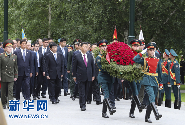 同日,习近平向俄罗斯无名烈士墓敬献花圈。