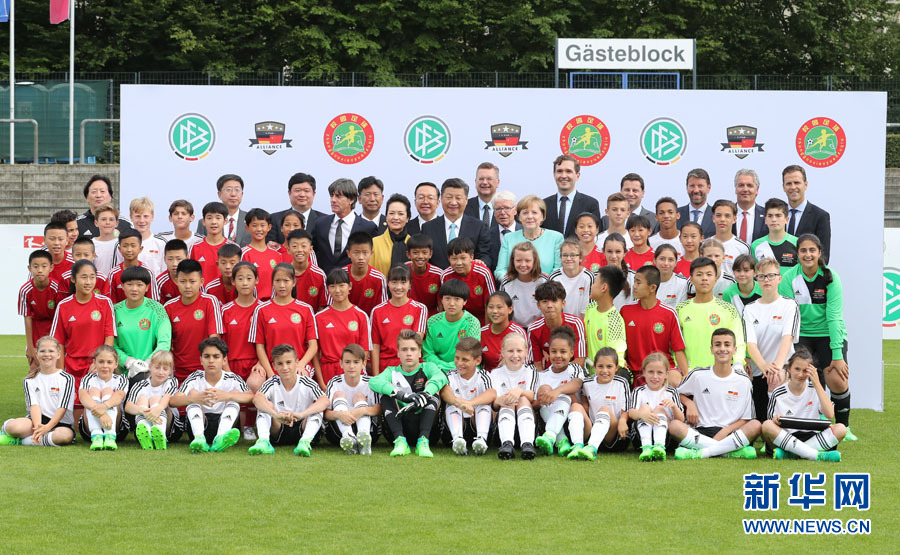 7月5日,国家主席习近平在柏林同德国总理默克尔共同观看中德青少年足球友谊赛。这是习近平和夫人彭丽媛同默克尔与双方小球员合影。新华社记者王晔摄