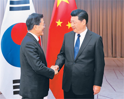 两国元首还就朝鲜半岛形势交换了看法。习近平指出,中方坚持实现半岛无核化,坚持维护半岛和平稳定,坚持通过对话协商解决问题,主张所有有关各方严格遵守联合国安理会有关决议。中方支持韩国新政府积极尝试同朝方重启接触对话、改善关系。国际社会应该一道努力,为缓和半岛局势发挥积极作用。