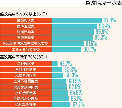 对督察发现的问题,省环保督察组按照9大类24分项进行了统计,其中,问题整改进度较快,整改完成率在90%以上的有6项,较上周增加一项。分别为:建筑施工类97.8%、噪声治理类96.4%、油烟污染类95.9%、市容市貌类95.3%、环境保护决策部署贯彻落实类91.6%、工业企业污染源类90.7%。问题整改进度较慢,整改完成率低于70%的有8项,分别为:工业园区类46.7%、自然保护区类53.8%、风景名胜区类56.3%、土壤环境质量类60.9%、饮用水源保护类62.6%、水环境质量类64.6%、生活污水处理类65.1%、机动车治理类67.7%。
