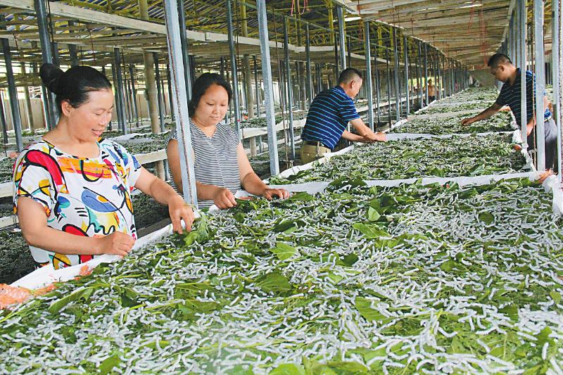 通过对蚕桑产业提档升级,发展高端丝绸,绵阳市涪城区蚕桑产业走出国门,每年出口生丝100余吨,成为带动农户增收的特色现代农业。图为7月4日,涪城区杨家镇五村的标准化蚕房里,蚕农正在照料蚕宝宝。王荔 摄