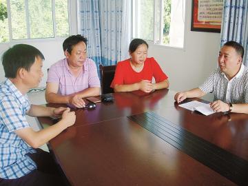 鹤峰乡党委副书记、纪委书记、石曲子村第一书记邓家中(右一)和村“两委”干部共商脱贫攻坚工作。
