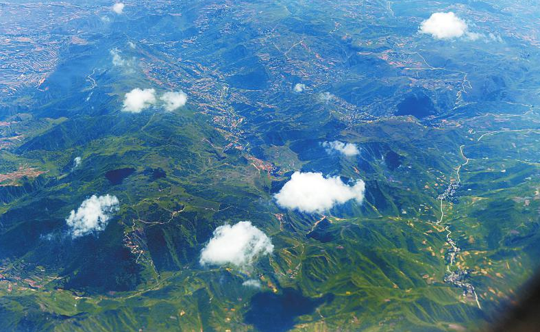7月31日,记者在成都双流机场飞往西宁机场的航班上俯拍,只见云朵下一座座山脉被绿色覆盖,犹如一片绿色的地毯铺展在四川大地上,美轮美奂。本报记者李向雨摄