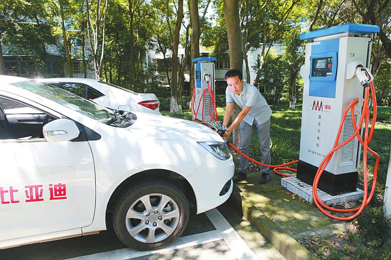广安城区市民用直流充电桩为新能源汽车充电。广安市今年将完成1000台充电桩建设,可同时供3000至4000辆新能源汽车充电。