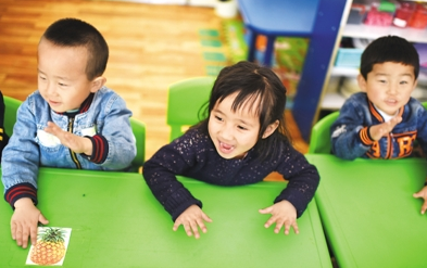 青海免费教育惠及各族学生。图为青海省黄南藏族自治州幼儿园小班教室内,藏族女孩夏央娜姆(中)和伙伴在课堂上。新华社记者张宏祥摄