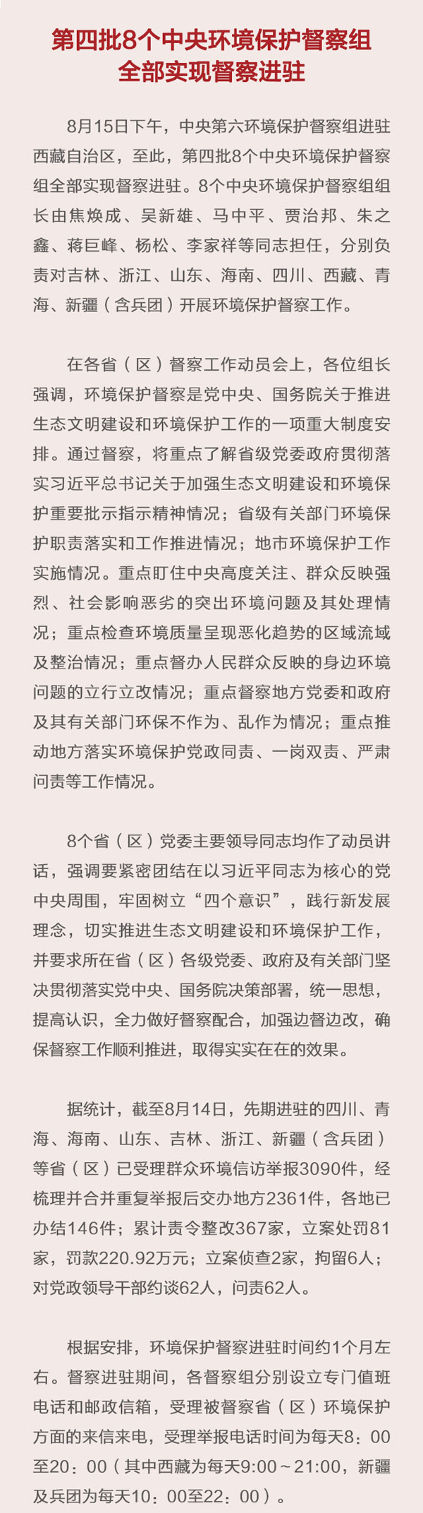 15日下午,中央第六环境保护督察组进驻西藏自治区,至此,第四批8个中央环境保护督察组全部实现督察进驻。8个中央环境保护督察组分别负责对吉林、浙江、山东、海南、四川、西藏、青海、新疆(含兵团)开展环境保护督察工作。
