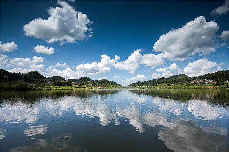 摩尼镇联盟村的水库与蓝天白云交相辉映