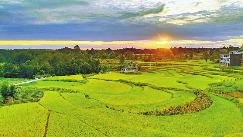 9月2日,晚霞中的南江县双流乡菩船村,农舍与稻田交织成一幅丰收图画。南江县加强科学种植技术指导,全县25万多亩水稻丰收在望。 程永红 肖定怀 摄(视觉四川)