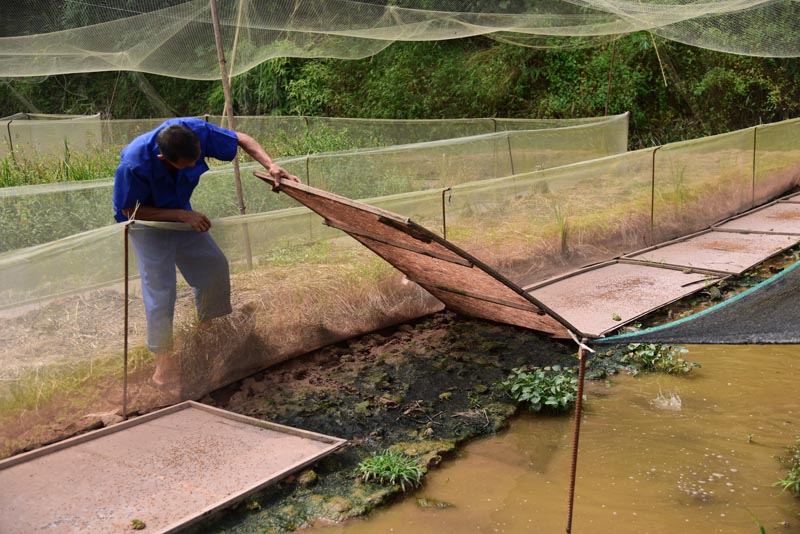 叙永县马岭镇龙盘村的青蛙养殖基地内,农户正在管护喂养。