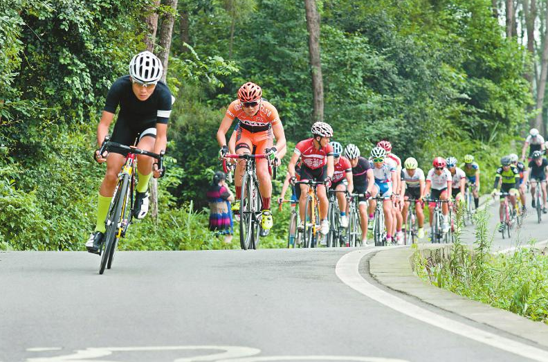 成都市蒲江县,自行车选手在风光秀丽的茶山绿道角逐。祝纯健摄(资料图片)
