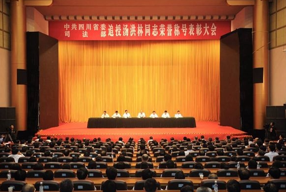 表彰大会上,司法部副部长、政治部主任王双全宣读《司法部关于追授汤洪林同志“全国司法行政系统一级英模”荣誉称号的决定》,省委常委、组织部部长黄建发宣读《中共四川省委关于追授汤洪林同志“四川省优秀共产党员”称号的决定》。张军和邓小刚分别向汤洪林同志的妻子杜明英、儿子汤童颁发荣誉证书和证章。司法厅主要负责同志介绍了汤洪林同志先进事迹。