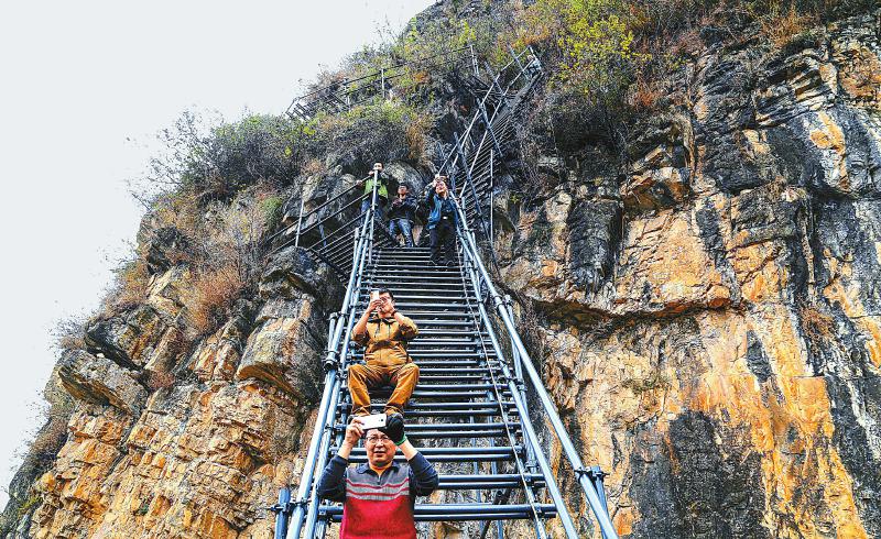 游客们坐在钢梯上拍摄悬崖村的自然美景。本报记者 吴传明 摄