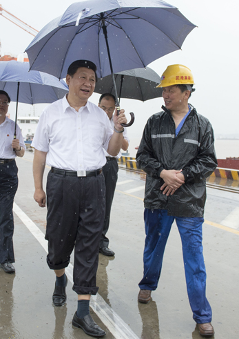 2013年7月21日至23日,习近平在湖北调研全面深化改革问题和当前经济运行情况。21日上午,习近平冒雨来到武汉新港阳逻集装箱港区考察。新华社记者李学仁摄