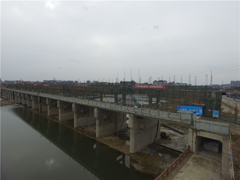 近段时间,在湔江成绵高速公路大桥下游处, 广汉市龙井堰水闸工程正在加紧施工。工程采用闸坝结合的方式拦蓄河水,拦水高度为10.2米,工程设计洪水标准为50年一遇,设计灌溉面积2.5万亩。工程总工期20个月,计划2018年底全面完工。