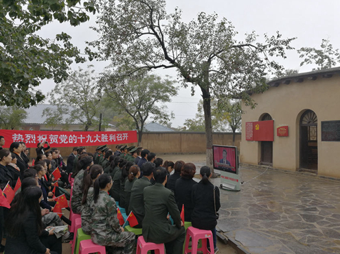 西柏坡纪念馆部分干部职工、西柏坡消防中队和石家庄市邮政局部分干部在中共中央旧址七届二中全会会址前一起观看党的十九大开幕会,许多各地赶来的观众也自动加入收看的队伍。陈汝健摄