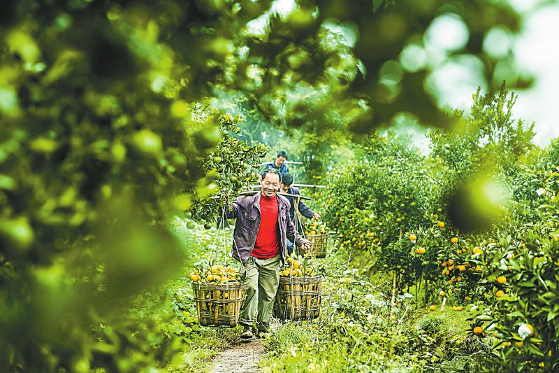 资阳市雁江区碑记镇二十万亩蜜橘量价齐升。图为近日,种植户将采摘的蜜橘挑送到收购点。彭晓秋摄