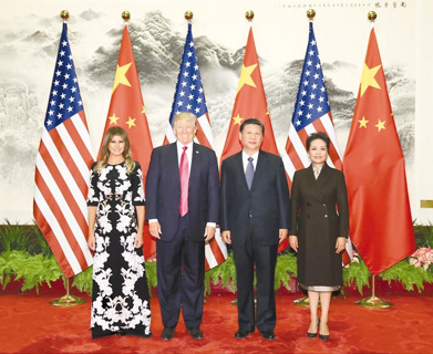 11月9日,国家主席习近平在北京人民大会堂东门外广场举行欢迎仪式,欢迎美利坚合众国总统唐纳德·特朗普对中国进行国事访问。这是习近平和夫人彭丽媛在人民大会堂同特朗普夫妇合影。