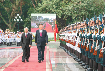 会谈前,阮富仲在主席府广场举行盛大欢迎仪式。广场外簇拥着身着民族服装迎候习近平的当地民众。习近平乘车抵达时,越南少年儿童挥舞着中越两国国旗热烈欢迎习近平到来。阮富仲在停车处迎接,越南儿童向习近平献上鲜花。习近平同阮富仲登上检阅台。军乐队奏中越两国国歌,鸣21响礼炮。习近平在阮富仲陪同下检阅仪仗队。全体仪仗队员用越南语高呼“祝总书记身体健康”。习近平同越方陪同人员握手,阮富仲同中方陪同人员握手。习近平和阮富仲返回检阅台,观看分列式。两国领导人前往越共中央驻地时,越南青年抛撒花瓣欢迎。