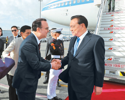 当地时间11月12日下午,应东盟轮值主席国菲律宾总统杜特尔特邀请,国务院总理李克强乘专机抵达马尼拉,出席12日至14日在这里举行的第二十次中国—东盟(10+1)领导人会议、第二十次东盟与中日韩(10+3)领导人会议和第十二届东亚峰会,并在与会后对菲律宾进行正式访问。