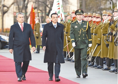 会谈前,欧尔班在匈牙利国会大厦广场为李克强举行了隆重的欢迎仪式。中匈国旗迎风飘扬。军乐队高奏两国国歌。李克强在欧尔班陪同下检阅了仪仗队。随后,两国总理观看了仪仗队和骑兵分列式以及军乐队的行进表演。