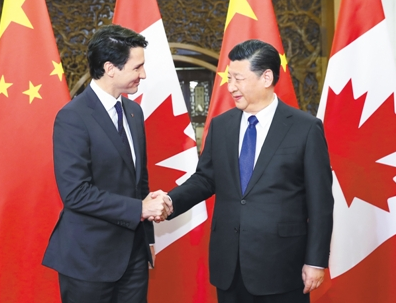 习近平欢迎特鲁多再次访华。习近平指出,中加两国领导人保持密切交往,对两国关系发展起到了重要引领作用。中加两国各有优势,互补性强,合作潜力巨大。希望双方拓宽思路,采取积极措施,推动两国关系取得更多实实在在的成果。